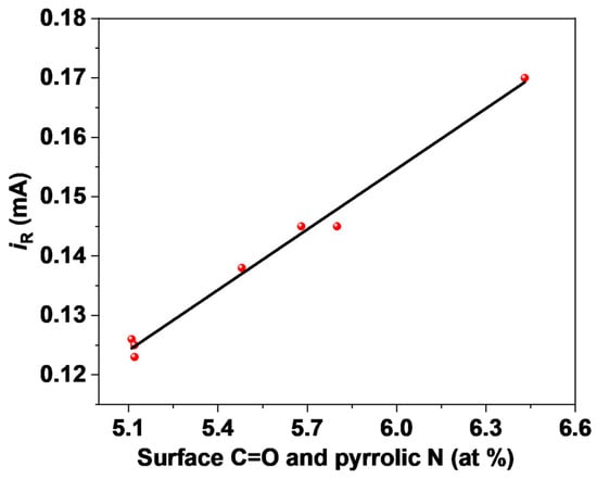 In light of the experimental results and viewpoints in the literature, we calculated the surface C=O and pyrrolic N content on the basis of Figure 6b,c; the results are also summarized in Table 2. It turns out that the H2O2 partial current at 0 V correlates linearly with the surface C=O and pyrrolic N content (Figure 13), substantiating that the C atoms in or adjacent to these species are the active sites for 2e-ORR to H2O2. We also analyzed the correlation with the surface contents of C=O and other N species; however, only highly scattered data points could be obtained.