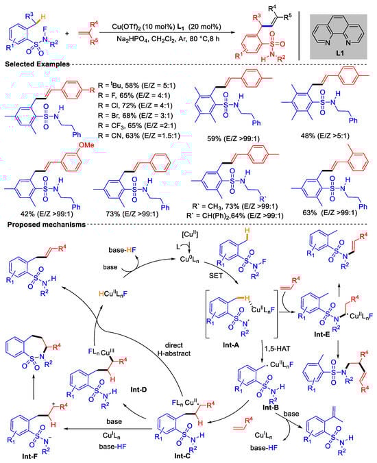 - Zhong, L.-J.; Lv, G.-F.; Ouyang, X.-H.; Li, Y.; Li, J.-H. Copper-Catalyzed Fluoroamide-Directed Remote Benzylic C–H Olefination: Facile Access to Internal Alkenes. Org. Chem. Front. 2022, 9, 4309–4315. [Google Scholar] [CrossRef]