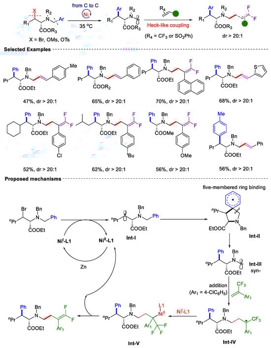 The Shen/Li/Tang group has reported a new route to achieving alkene Heck-type alkylation by means of a nickel-catalyzed reductive Heck-type C(sp3)−C(sp2) coupling cascade of α-amino-β-bromo acid esters with alkenes, which consists of a bromoalkane-directed radical 1,4-aryl shift toward distal (gem-difluoro) alkenylated arylalanines (Scheme 2 up) []. This reaction allows for the formation of α-aminoalkyl radicals, which are generated from neophyl-type aryl migration and function as robust coupling partners, to initiate a sequence of neophyl-type rearrangements with Heck-like C(sp3)-C(sp2) coupling using trifluoromethylstyrenes and vinyl sulfones such as Michael acceptors, thereby achieving a new radical cascade for the simultaneous installation of an aromatic ring and olefin motif into the amino acid backbones. This reaction enables the two-site simultaneous inlay of two functional groups—an aromatic ring and an olefin group—into the α-amino-β-bromo acid ester bones, with excellent regio- and diastereoselectivity.