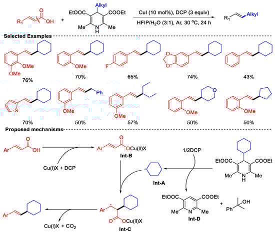 In 2020, our group reported the copper-catalyzed oxidative decarboxylation of cinnamic acids with 4-alkyl-1,4-dihydropyridines to form C(sp3)-C(sp2) bonds, using 4-alkyl-1,4-dihydropyridines as the general alkylating reagents (Scheme 3) []. In the presence of CuI and dicumyl peroxide (DCP), a variety of α,β-unsaturated carboxylic acids underwent oxidative decarboxylative alkylation with 4-alkyl-1,4-dihydropyridines under various mild internal conditions, a broad substrate scope, and excellent functional group tolerance. This method has significant potential for application by using inexpensive and stable cinnamic acids instead of alkenyl halides and nitro-olefins. Using cheap and stable cinnamic acids instead of alkenyl halides and nitroalkenes, this reaction enables the easy generation of alkyl radicals from 4-alkyl-1,4-dihydropyridines to initiate the reaction in the presence of 4-alkyl-1,4-dihydropyridines and DCP, leading to a wide range of substrates and compatible functional groups, and provides a new way to access a variety of internal alkenes under mild conditions.
