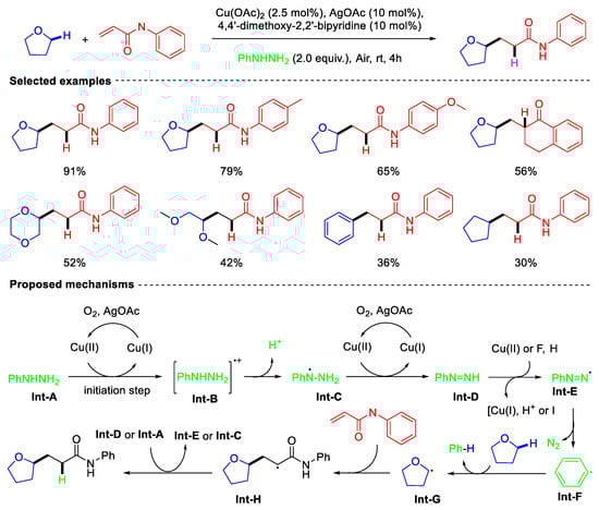 The Qin group successfully established a novel approach for the direct formal addition of aliphatic C-H bonds to alkenes under mild reaction conditions. This process, which is mediated by a phenyl radical, represents an alternative to conventional methods, offering an avenue for the addition of C(sp3)-H bonds to alkenes through a copper-catalyzed aerobic formal addition of aliphatic C-H groups to alkenes. The methodology is characterized by simple and safe experimental procedures. The reaction conditions are compatible with a range of alkanes and electron-deficient alkenes, which afford a wide range of addition products. The results of their preliminary studies indicated that the phenyl radical and 2-tetrahydrofuranyl radical are the most likely participants in the mechanism. Additionally, the PhNHNH2 appears to function not only as an effective HAT reagent precursor but also as an excellent donor of hydrogen atoms in this reaction. Additional synthetic transformations revealed that the direct formal aliphatic C(sp3)-H bond addition reaction displayed excellent synthetic versatility.