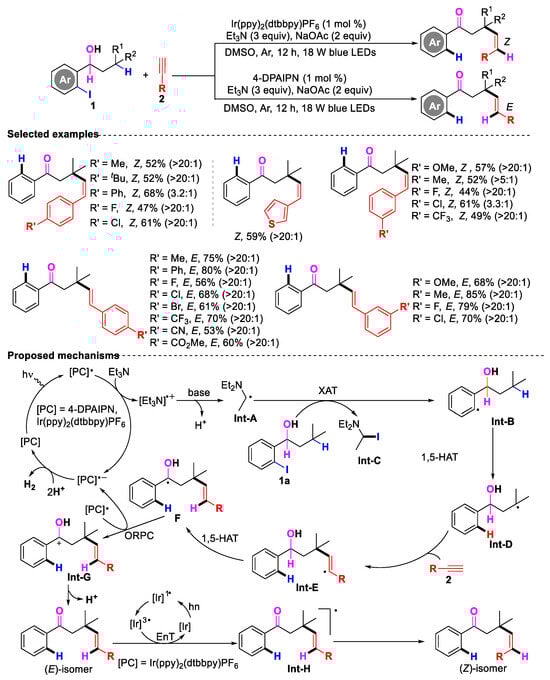In 2025, our research group developed a dual photoredox catalytic strategy for the stereodivergent synthesis of (Z)- and (E)-pent-4-en-1-one derivatives through photoinduced C(sp3)-H alkenylation–dehydrogenation of o-iodoarylalkanols with alkynes (Scheme 5) []. This methodology leverages sequential C–I bond homolysis and dual hydrogen atom transfer (HAT) cascades to achieve both site- and stereoselectivity control under mild visible light irradiation. The stereochemical outcome was systematically modulated through the strategic selection of terminal alkyne coupling partners and photocatalysts, with the experimental evidence supporting a triplet energy transfer (TEnT) mechanism for Z-isomer formation from E-configured intermediates when employing Ir(ppy)2(dtbbpy)PF6.