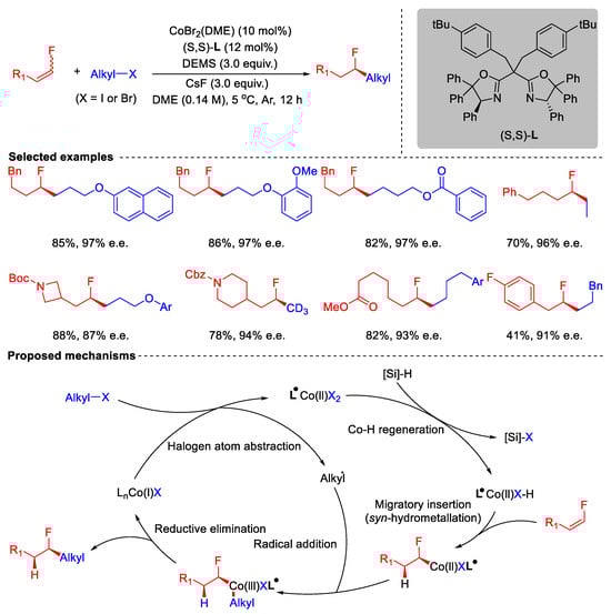 Enantioselective C(sp3)–C(sp3) coupling has a substantial impact on organic synthesis, yet it remains a challenging process. Cobalt has been instrumental in the advancement of homogeneous organometallic catalysis; however, there are only a limited number of instances in which it has been employed in asymmetric cross-coupling. The Yao Fu group has reported a cobalt-catalyzed enantioselective C(sp3)–C(sp3) coupling reaction, namely alkene hydroalkylation, which provides a new route to access chiral fluoroalkenes. This reaction represents a catalyst-controlled enantioselective coupling mode in which a tailor-made auxiliary is unnecessary. It thus offers a means of introducing an aliphatic C–F stereogenic center at the desired position in an alkyl chain. Cobalt exhibits several advantageous properties, including low cost and low toxicity, and has played a significant role in the development of homogeneous organometallic catalysis. While cobalt catalysts have been demonstrated to be highly effective for carbon–carbon bond formation, they are not well suited to the asymmetric version of this reaction. The authors of this article established a cobalt hydride catalytic system for alkene hydroalkylation, achieving a high level of selectivity with regard to both the regioselectivity and enantiomeric excess (Scheme 6) [].