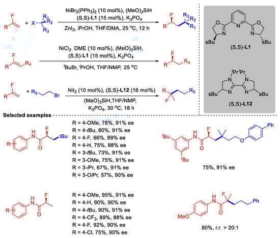In 2024, the Chu group published details of the creation of an innovative nickel-catalyzed asymmetric radical transfer approach, which allows for the selective functionalization of alkenyl fluorides into stereo-defined alkyl fluorides (Scheme 7) []. The asymmetric hydrogen atom transfer (HAT), asymmetric alkyl transfer, and regioselective HAT/alkyl couplings of α-fluoroacrylamides with primary, secondary, and tertiary alkyl halides have been achieved with high efficiency and stereoselectivity using simple chiral nickel complexes. This allows for the facile and modular construction of diverse, structurally complex secondary and tertiary F-containing stereocenters. These transformations demonstrate a broad substrate scope and high regio- and stereoselectivity, rendering them suitable for late-stage modifications.