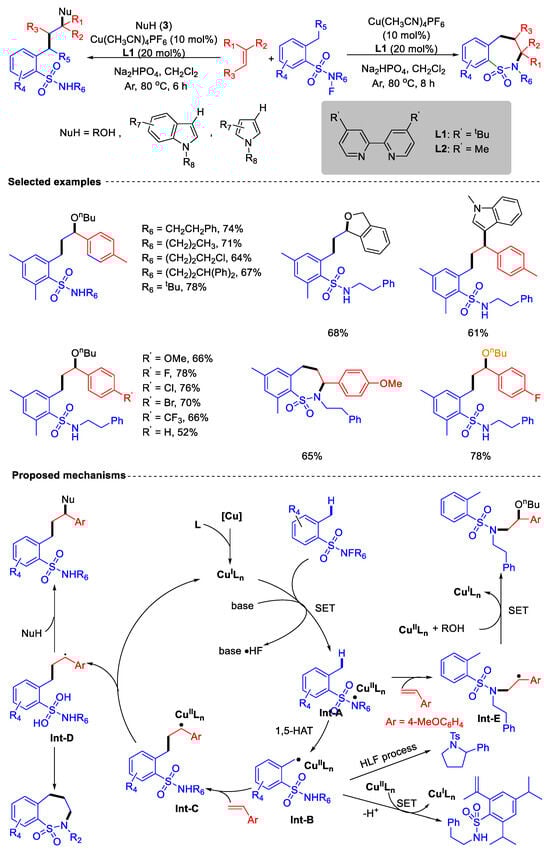 In 2022, our group developed a new, site-selective, and copper-catalyzed intermolecular process for redox-neutral difunctionalization of alkenes with N-fluoro-o-alkylbenzeneamides and nucleophiles, enabled by the fluoroamide-directed remote benzylic C(sp3)−H functionalization for the synthesis of functionalized dialkyl ethers, 3-alkylindoles, and 3-alkylpyrroles (Scheme 8) []. This strategy is also applicable to the two-component alkene-alkylamidation of alkenes with N-fluoro-o-alkylbenzenamides via [5 + 2] annulation for the preparation of useful benzo[f]-[1,2]thiazepine-1,1-dioxides and represents the first general alkene difunctionalization process enabled by fluoroamide-directed remote benzylic C-(sp3)-H functionalization via HAT that does not require the addition of external oxidants. This protocol demonstrates excellent site selectivity; tolerance to a wide range of styrenes, N-fluoro-2-methylbenzeneamides, alcohols, indoles, and pyrroles bearing various functional groups; and potential applications in the late modification of natural products and drug derivatives. In particular, the fluoroamide-directed C(sp3)-H-functionalized alkene difunctionalization strategy offers further prospects for both essential alkene and C-H bond feedstock transformations.