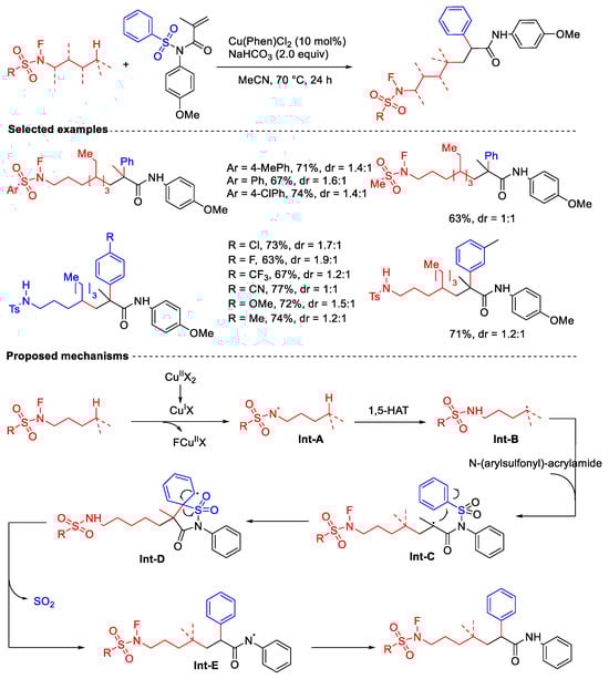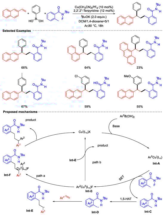 - Rui, R.; Wang, B.; Xu, X.-J.; Zhang, Z.; Chen, X.; Liu, X.-Y. Cu-Catalyzed Alkylarylation of Alkenes via N-Directed Remote C(sp3)–H Functionalization. Org. Chem. Front. 2024, 11, 1484–1489. [Google Scholar] [CrossRef]