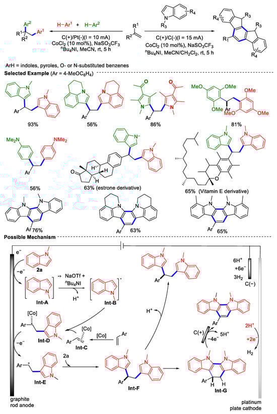 In 2020, a cobalt-promoted electrochemical 1,2-diarylation of alkenes with electron-rich aromatic hydrocarbons via direct dual C-H functionalization was described (Scheme 11) []. This method employs a radical relay strategy to produce polyaryl-functionalized alkanes. By simply using a graphite rod cathode instead of a platinum plate cathode, the chemoselectivity of this radical relay strategy is shifted to the dehydrogenative [2+2+2] cycloaddition via 1,2-diarylation, annulation, and dehydrogenation cascades, leading to complex 11,12-dihydroindolo [2,3-a] carbazoles.