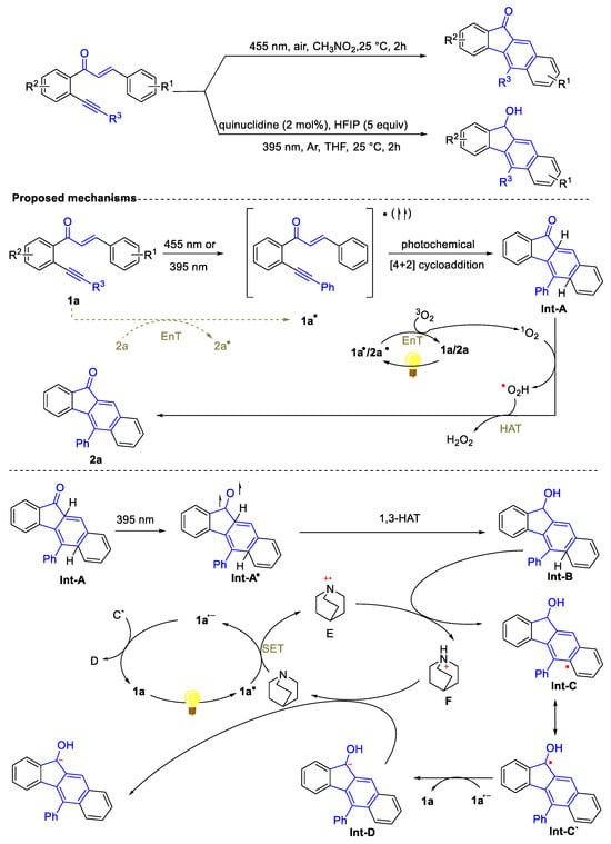 Professor Liang’s group disclosed a novel autophotocatalytic strategy for the divergent synthesis of benzo[b]fluorenones and benzo[b]fluorenols from enone-ynes (Scheme 12) []. This metal-free, exogenous photocatalyst-independent methodology operates under mild conditions in both batch reactors and continuous flow systems, demonstrating remarkable photochemical versatility through multiple activation modes: energy transfer (EnT), electron transfer (ET), hydrogen atom transfer (HAT), and photocycloaddition.