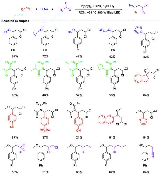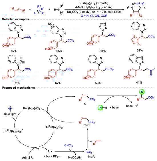 Polychlorinated hydrocarbons, especially those with di- or tri-chloromethyl groups, are widely used in natural products, pesticides, and various bioactive molecules [,]. Since Kharasch reported the atom transfer radical addition (ATRA) of terminal alkenes with bromotrichloromethane as the polychloromethyl moiety, the radical addition reaction of alkenes—including alkene difunctionalization—has become one of the most powerful strategies for the rapid assembly of diverse complex polyhaloalkyl-containing molecules from abundant and readily available starting materials. Traditional radical-mediated alkene functionalization methods for the synthesis of polyhaloalkyl-containing compounds usually focus on one-component atom transfer radical cyclization (ATRC) and two-component atom transfer radical addition (ATRA) processes via C-halogen bond homolysis using photocatalysts (e.g., ultraviolet light, sunlight), thermocatalysts, and/or highly toxic organic initiators. To broaden their applications, recent efforts have focused on polychloroalkyl radical-initiated two- and three-component alkene difunctionalization reactions with polyhaloalkanes and nucleophile aryl C(sp2)-H bonds, beyond ATRA and ATRC, which allow for the preferential cleavage of the C-H bonds in polyhaloalkanes, leading to the formation of polychloroalkyl radicals due to the enthalpic and stereoelectronic effects.