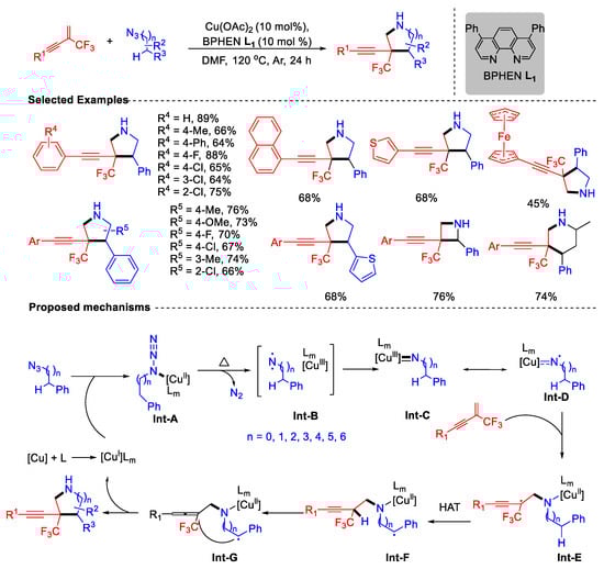 In 2024, a new approach to copper-promoted radical-mediated divergent intermolecular [2 + n] heteroannulation of β-CF3-1,3-enynes with alkyl azides was developed. This process allows for the synthesis of four- to ten-membered N-heterocycles (Scheme 14) []. The reaction of the azide with the active Cu species results in the intermediate A, which is then thermally decomposed to form the triplet-free nitrene intermediate B. The intermediate B is converted to the Cu (III) nitrene intermediate C or D. The addition of the intermediate C across the C=C bond in olefin results in the alkyl radical intermediate E, which is then subjected to HAT to form another alkyl radical intermediate F. Finally, the intermediate F is converted to the intermediate G via radical substitution, and radical addition cascades are employed to produce the desired product and regenerate the active Cu species.
