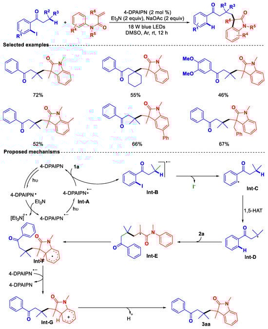 A photoredox-mediated 1,5-hydrogen atom transfer (HAT) strategy for remote β-C(sp3)-H alkylation of 1-(o-iodoaryl)alkan-1-ones was established in 2025 (Scheme 16) []. This catalytic platform enables the construction of sterically congested quaternary carbon centers through radical–polar crossover processes, converting readily accessible 1-(2-iodoaryl)ketones and N-arylacrylamides into structurally diverse β-alkylated arylalkanones under mild visible light conditions.