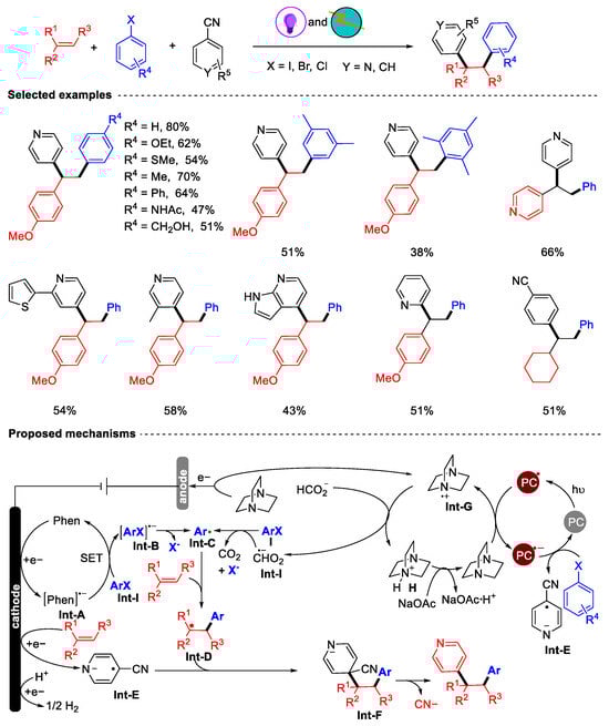 In 2023, Li and co-workers reported a new electrophilic catalytic intermolecular reductive 1,2-diarylation of alkenes (Scheme 17) [], using aryl halides and cyanoaromatics, to produce polyarylated alkanes. The combination of synergistic cathodic reduction and visible light photoredox catalysis enables the use of various electron-rich and electron-deficient aryl halides with a range of alkenes and cyanoaromatics. This approach allows us to utilize the broad substrate scope, excellent functional group compatibility, and excellent selectivity of this reaction. Mechanistic investigations revealed that this reaction may proceed via a radical process that is initiated by the reductive generation of aryl radicals from aryl halides and terminated by radical–radical coupling with cyanoaromatic radical anions.