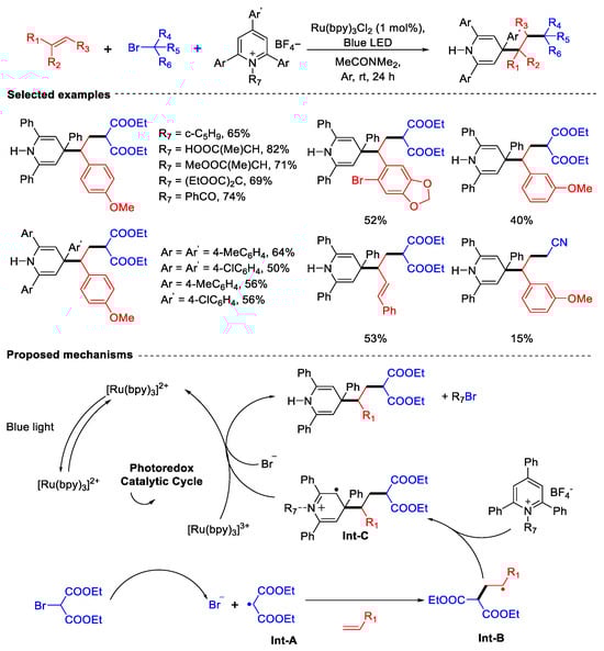 The potential mechanism for this alkene dialkylation protocol is illustrated in the accompanying Scheme 15. The intermediate A is formed by means of a single-electron transfer between the α-carbonyl alkyl bromide and the [Ru(bpy)3]2+• intermediate. This is then irradiated with blue LED light to form the [Ru(bpy)3]2+. The addition of the alkyl radical intermediate A across the C=C bond of the alkene affords the new alkyl radical intermediate B, which is then added to the pyridin-1-ium salt to form the alkylated pyridin-1-ium radical cation intermediate C. Finally, single-electron oxidation and dealkylation of intermediate C affords the desired product.