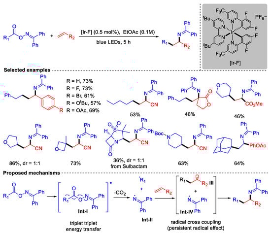 - Tuhin, P.; Peter, B.; Felix, S.; Frank, G. Photosensitized Intermolecular Carboimination of Alkenes through the Persistent Radical Effect. Angew. Chem. Int. Ed. 2020, 59, 3172–3177. [Google Scholar]