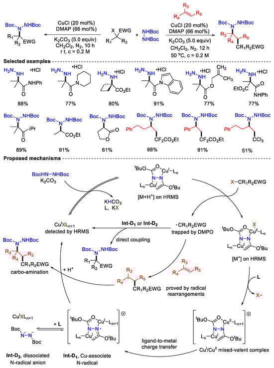 - Lu, D.; Li, Y.; Wang, P.; Wang, Z.; Yang, D.; Gong, Y. Cu-Catalyzed C(sp3)–N Coupling and Alkene Carboamination Enabled by Ligand-Promoted Selective Hydrazine Transfer to Alkyl Radicals. ACS Catal. 2022, 12, 3269–3278. [Google Scholar] [CrossRef]