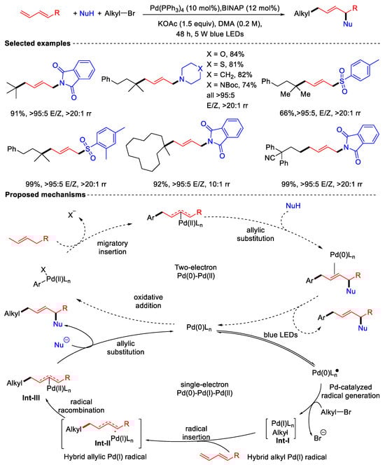 The Glorius group demonstrated that a practical and general palladium-catalyzed, radical three-component coupling process can, indeed, overcome the aforementioned limitations through an interrupted Heck/allylic substitution sequence mediated by visible light (Scheme 21) []. The selective 1,4-difunctionalization of unactivated 1,3-diene compounds, including butadiene, has been achieved by employing diverse commercially available nucleophiles, including nitrogen-, oxygen-, sulfur-, and carbon-based species, in conjunction with unfractionated alkyl bromides. The construction of sequential C(sp3)−C(sp3) and C−X (N, O, S) bonds has been achieved with efficiency and a broad scope, exhibiting high functional group tolerance. The versatility and adaptability of the strategy have been demonstrated in gram-scale reaction procedures and simplified synthesis routes to complex ethers, sulfones, and tertiary amines, many of which would be challenging to attain via established conventional methods.