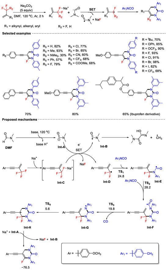 The entire process is highly exergonic, with a free energy release of 76.5 kcal mol−1. The unsaturated moiety (such as alkynyl and alkenyl) in the α position plays a pivotal role in stabilizing and activating the radical intermediates through its electron and conjugative effect. This strategy employs DMF as the SET reagent, with the assistance of Na2CO3, to activate the C(sp3)–F bond of 2-tri-fluoromethyl-1,3-enynes and form difluoromethyl C(sp3)-centered radicals. This is followed by a [3 + 2 + 1] annulation reaction with isocyanates under transition-metal- and photocatalyst-free conditions. This enables the efficient, modular synthesis of monofluorinated 3,4-dihydropyrimidin-2(1H)-ones and the late-stage derivatization of complex natural products and drugs. This method offers a straightforward operational approach, excellent functional group compatibility, and precise selectivity, paving the way for a new C–F activation strategy in the development of novel fluoroalkyl radical chemistry.