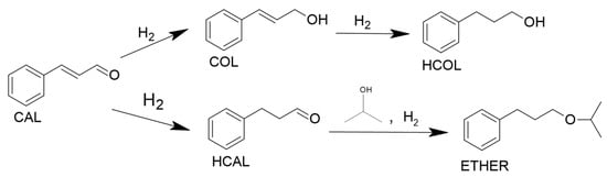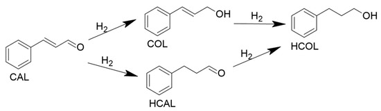 Next to C=O and C=C bonds also, the aromatic ring is present in cinnamaldehyde and therefore, the molecule is an optimal model reactant for evaluation of the effect of active metals and other properties of the catalysts on the selective hydrogenation of different types of double bonds. The products of cinnamaldehyde hydrogenation are cinnamylalcohol (COL, formed by hydrogenation of C=O), hydrocinnamaldehyde (HCAL, formed by hydrogenation of C=C), and hydrocinnamal alcohol (HCOL, formed by hydrogenation of both, C=O and C=C) (Figure 1). These products are utilized in the field of chemical specialties as intermediates for pharmaceuticals, perfumes, and fragrances [].