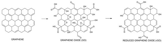 Based on the mentioned data, carbon-based 2D materials, namely two types of graphene oxides, have been selected for the presented study. Graphene is the pioneering example of a two-dimensional material, isolated from natural graphite in 2004, which has since then been extensively investigated in the wide range of potential applications []. Layered 2D materials are characterized by minimum thickness to the physical limit, large surface area, uniformly exposed lattice plane, adjustable electronic state, ability of surface defect formation, and possibility of controlled surface functionalization [,]. One of the possible utilizations of 2D materials targets the catalysis as the catalyst or as the supports for various catalytically active metals. Excellent catalytic activities with superior selectivities have been described in various chemical and electrochemical reactions []. In the presented research, graphene is used in its oxidized form—graphene oxide. Two types of graphene oxide were synthesized following two previously described preparation methods, namely Hummer’s method [] and Tour’s method [] (described in Section 3). These methods should result in graphene oxides with slightly different compositions of the surface groups. Graphene oxide prepared by Hummer’s method (HUGO) [] should be characterized by the presence of mainly epoxy and hydroxyl groups while graphene oxide prepared by Tour’s method (TOGO) [] contains mainly carboxyl groups. Active metals deposition on the graphene oxide supports can be performed using various common as well as novel preparation methods. Simple wet impregnation of the GO is commonly accompanied by the reduction by various reduction agents such as NaBH4, ethylene glycol, or hydrazine [,,,,]. The reduced graphene oxide (rGO) does not exactly have a defined structure since its reduction is usually only partial and different reduction methods result in different properties of rGO (Figure 2); however, it is characterized by the presence of hydroxyl, carbonyl, carboxyl, and epoxide groups on the surface that makes the reduced graphene oxide sheet soluble in water and offers binding sites for metal nano particles.