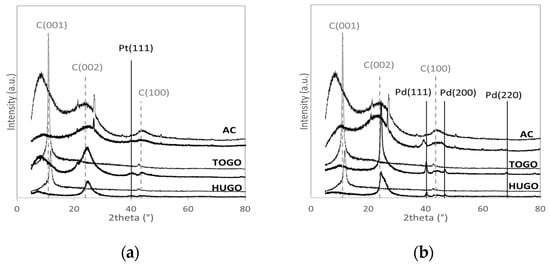 XRD spectra of (a) Pt/rHUGO, Pt/rTOGO, and Pt/AC and (b) Pd/rHUGO, Pd/rTOGO, and Pd/AC and of the pure supports HUGO, TOGO, and AC ((a,b), dotted line).