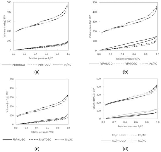 Nitrogen adsorption–desorption isotherms of (a) Pt, (b) Pd, (c) Rh, and (d) Ru and Co supported catalysts, full line = HUGO, dashed line = TOGO, dots = AC.