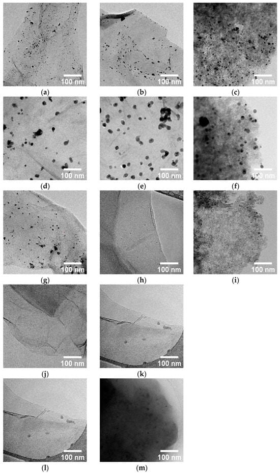 In order to determine the size of small metals NPs supported on carbon-based materials, transmission electron microscopy was used (for reduced catalysts). Metal particles, as well as sheets of 2D graphene oxides, are clearly visible on the images of all tested catalysts (Figure 6a–m). The particle size measurement was performed using TEM images with a scale of 20–2000 nm, and the particle size distribution of all reduced catalysts is demonstrated in histograms in the Supplementary Materials (Figures S11–S15) and summarized in Table 2.