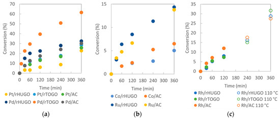 Conversions as a function of time over (a) Pt and Pd catalysts, (b) Co and Ru catalysts, and (c) Rh catalysts (empty dots indicate increase in reaction temperature from 80 °C to 110 °C after 60 min in case of testing Rh catalysts) (reaction conditions: CAL, isopropyl alcohol, 80/110 °C, 1 MPa, and 6 h).