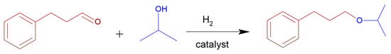 Using GC-MS analysis, the side product formed during the experiments was determined as ether, namely 3-isopropoxy-propan-1-yl benzene. This ether is most probably formed by the reaction of aldehyde(s) with isopropyl alcohol through reductive etherification (Figure 8). A similar reaction under comparable reaction conditions has been described previously by L. J. Gooßen et al. [] who described the reductive etherification of ketones catalyzed by a heterogeneous platinum catalyst (commercial Pt/C) at ambient hydrogen pressure []. Reductive etherification of aldehydes had been described also by Kalutharage, N. et al. who published successful synthesis of 1-(sec-butoxymethyl)-4-methoxybenzene by catalyzed reaction of methoxybenzaldehyde with butan-2-ol under hydrogen pressure 0.1–0.2 MPa at 110 °C []. Since the reaction conditions as well as the nature of the catalysts are close to the described in the listed references, it is assumed, that the formation of this ether is highly probable. On the other hand, it is surprising that none from the long list of published works focused on CAL hydrogenation has revealed or discussed the formation of this product. To avoid this side reaction, other solvents were tested in CAL hydrogenation, including acetonitrile, dimethyl sulfoxide, diethyl ether, and dichloromethane. The side product, ether, was not formed. However, the CAL conversions achieved were significantly lower, with no hydrogenation occurring in DMSO.