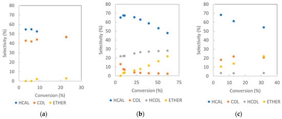 Selectivities toward all formed products as a function of CAL conversion achieved over (a) Pt/rHUGO, (b) Pd/rTOGO, and (c) Rh/rTOGO.