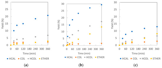 To demonstrate the formation of different products over Pd catalysts in more detail, the graphs depicting the yields of the products in time are attached (Figure 10). HCAL acts as the main product from the beginning of the reaction and its fast formation of HCAL mainly within the first 60 min of the reaction can be observed in experiments over all Pd catalysts. However, HCAL formation slowed down significantly with the reaction time. On the other hand, the concentration of undesired ether is increasing during the whole experiment. The formation of COL follows a similar pattern across all three Pd catalysts: COL is formed only during the first 30 min, after which it is assumed that the rate of COL formation reaches a maximum with its further hydrogenation to HCOL.