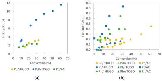 Ratios of formed products (a) HCOL/COL and (b) ether/HCAL as a function of CAL conversion achieved over tested catalysts.