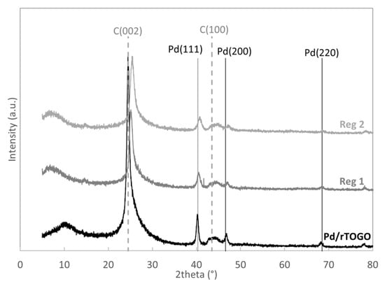 XRD spectra of all reduced catalysts as well as pure supports were measured. Diffraction patterns of platinum and palladium modified catalysts as well as pure supports are depicted in Figure 3. Diffraction patterns of other catalysts (Rh, Ru, and Co) are presented in Supplementary Materials (Figure S1). Pure graphene oxide supports exhibit the main diffraction peak at 11° 2θ at reflection plane C (001). This peak is shifted compared to the peak of activated carbon at the very same reflection plane which is located at 2θ = 9°. The peak confirming presence of graphene oxides sheets (2θ = 11°) disappears after the reduction of the material (by the ethylene glycol treatment during the impregnation step or by the following reduction of the prepared catalysts). The reduction is additionally confirmed by the appearance of a diffraction peak at 24° 2θ at reflection plane C (002), which is in consistence with previously published data [,,]. No presence of peak typical for GO was determined for all prepared catalysts, confirming reduction of graphene oxide supports during the impregnation step.