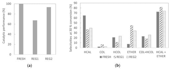 Based on the obtained results, reaction pathways of formation of HCOL via COL hydrogenation and of ether via reductive etherification of HCAL could be suggested (Figure 11).