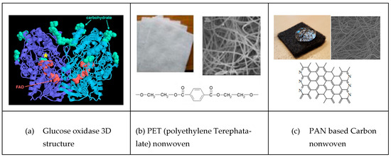 GOx enzyme (a) and supportive materials based on nonconductive PET nonwoven (b) and conductive carbon nonwovens (c).