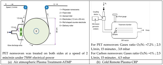 Figure 2. Plasma activation methods used: (a) air atmospheric plasma and (b) cold remote plasma nonwovens. - Surface modification using amino-based biopolymers such as chitosan;