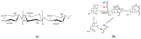 (a) Biosourced chitosan 100% deacetylated low molecular Weight Poly(D-glucosamine). (b) Possible mechanism for the crosslinking of amine-containing biopolymers with genipin [35].