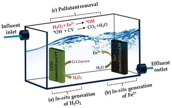 Glucose oxidase catalyzes the oxidation of β-D-glucose to gluconic acid and hydrogen peroxide, which can serve as a precursor for hydroxyl radical formation in Fenton-based reactions [10,11,12]. In the bio-Fenton (BF) process, hydrogen peroxide is generated in situ by enzymatic oxidation, reducing the need for external chemical inputs [13,14,15,16]. In the bio-electro-Fenton (BEF) process, enzyme-functionalized electrodes can both generate oxidants and serve as bioanodes, enabling simultaneous wastewater treatment and power generation [1,4,5,17]. These methods address some of the major limitations of traditional Fenton systems, such as the need for stored peroxide and issues related to iron sludge formation [1,13,14]