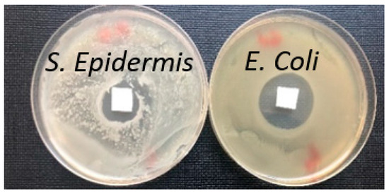 The antibacterial performance shown in Figure 5 was evaluated using a modified agar diffusion method based on ISO 20645:2004 [38] Samples were placed on agar plates inoculated with standardized suspensions of S. epidermidis (ATCC 12228) and E. coli (ATCC 25922). Plates were then incubated at 37 °C for 24 h. The zone of inhibition (Figure 5) confirms the additional antimicrobial effect of GOx-functionalized PET, supporting applications in hygiene textiles or for water decontamination though bacterial deactivation.