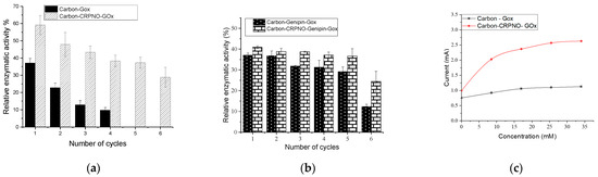 (a) Relative enzymatic activity for GOx immobilized on carbon nonwoven felt before and after CRPNO. (b) Relative enzymatic activity with Genipin bio-crosslinker for GOx immobilized on carbon nonwoven felt before and after CRPNO. (c) Catalytic current vs. D-glucose concentration at E = 0.5 V on carbon felt (without and with CRPNO) with immobilized GOx.