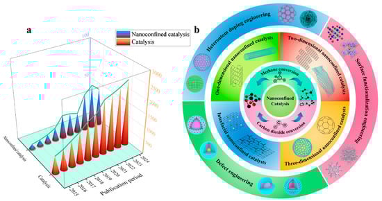 There have been substantial advancements in catalytic conversion technologies for carbon-based energy systems in recent years. These advancements can be attributed to interdisciplinary collaboration and integration, which have played a pivotal role in the emergence of novel conceptual frameworks within this domain. The concept of nanoconfined catalysis, pioneered by Xinhe Bao, refers to a catalytic mechanism that modulates catalyst electronic structures via nanoscale spatial or interfacial confinement effects, enabling precise control over reaction pathways and product selectivity []. Its core principle is leveraging quantum effects and microenvironment synergies to stabilize active sites and optimize intermediate adsorption energy, thereby markedly enhancing catalytic efficiency and selectivity [,,,,,,,]. Extensive research on nanoconfined catalysis has been conducted, with Web of Science data indicating a steady increase in publications concerning the development of nanoconfined catalysts for converting CO2 and CH4 into high-value chemicals (Figure 1a). For instance, Fan et al. achieved efficient room-temperature methane conversion to liquid C1 oxygenates by confining Cu atoms within ultrathin Ru nanosheets, with detailed reaction mechanisms elucidated []. He et al. developed thermally stable sub-2 nm Ni nanoparticles confined in SBA-15 mesochannels through combined surface hydroxyl modification and pore confinement strategies, addressing Ni catalyst deactivation via sintering and insufficient active site exposure in dry methane reforming []. Mo et al. confined the Ru3–SCs in Ni–PCN (porous carbon nitride)-222-PyrA by using the pre-coordination confinement strategy, and the resulting complex can efficiently electrocatalyze the reduction of CO2 to CH4 []. Lv et al. revealed that Cu–MOR catalysts synthesized via ion exchange contain elevated levels of zeolite-confined Cu2+ species, which synergize with non-thermal plasma to enhance direct methane oxidation to methanol []. Lu et al. designed Ag@Cu2O cascade nanoreactors with tunable shell thickness for CO2 reduction, demonstrating that moderate shell thickness optimizes CO diffusion and confinement effects to boost C2 product selectivity [].