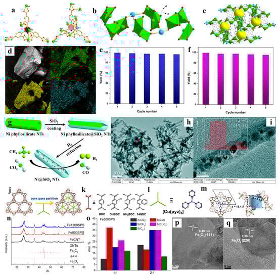 (a) Two types of coordination modes of I-TDP6− and II-TDP6−. (b) the S-shaped [Pb10K2(μ2-OH)2(COO)24] cluster. (c) The formation of the {Pb10K2} cluster (green polyhedron = Pb2+; blue ball = K+; H atoms are omitted for clarity). (d) The SEM-EDS analysis of as-synthesized NUC-45. (e) The recycled Knoevenagel condensation reaction catalyzed by NUC-45a. (f) Recyclability study for catalytic activities of NUC-45a in cycloaddition reaction. Reprinted with permission from Ref. []. Copyright American Chemical Society, 2022. (g) Schematic illustration of the process to exclusively confine Ni nanoparticles within the SiO2 NTs. (h,i) TEM images of NiPhy@SiO2 NTs catalysts after 70 h of DRM reaction. Reprinted with permission from Ref. []. Copyright Royal Society of Chemistry, 2018. (j) Schematic diagram of pore space partition strategy. (k) Four dicarboxylate ligands in SNNU-33 frameworks. (l) New pore-partition agent of [Cu(pyz)3] in this work. (m) Unit cell and the diameter and height of each segment in SNNU-33s. Reprinted with permission from Ref. []. Copyright John Wiley and Sons, 2024. (n) XRD patterns of used unsintered and sintered Fe/CNT catalysts. (o) Comparison of catalytic performances of Fe800SPS at different H2:CO2 ratios. High resolution TEM images of (p) the used FeCNT and (q) the used Fe800SPS. Reprinted with permission from Ref. []. Copyright Elsevier, 2020.
