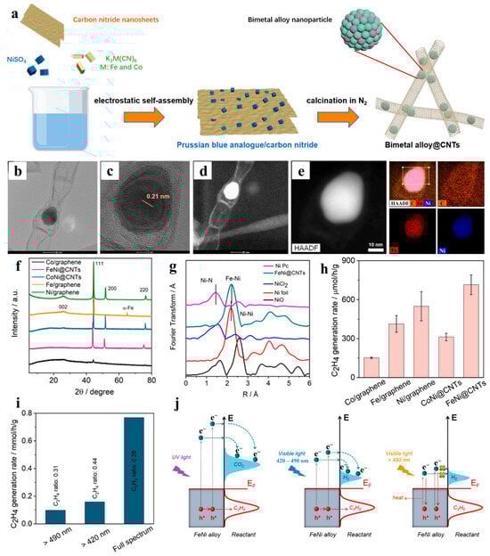 (a) Illustration of synthesis of carbon nanotube-confined bimetallic alloy photothermal catalysts. (b,c) TEM images of FeNi@CNTs. (d,e) High-angle annular dark field (HAADF) and elemental mapping images of FeNi@CNTs. (f) XRD patterns of different samples. (g) Fourier transform for the extended X-ray fine structure (EXAFS) measurements of FeNi@CNTs and standard references. (h) Photothermal catalytic performances of ODEC on various catalysts. (i) Effect of light band on the photothermal catalytic ODEC. (j) Photothermal effects in photothermal catalysis. Reprinted with permission from Ref. []. Copyright Elsevier, 2023.