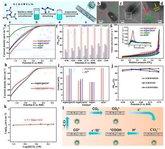 (a) Schematic illustration for the synthesis of Ni@NC@NCNT. (b) TEM and (c,d) high-resolution (HR) TEM of Ni@NC@NCNT. (e) LSV curves. (f) Faradaic efficiencies of CO. (g) N2 isotherms and the corresponding pore size distributions (inset). (h) LSV curves obtained in CO2-saturated 0.5 M KHCO3 aqueous solutions with the pretreatment of PO43−, (i) atomic content of Niδ+ and pyridinic N in Ni@NC@NCNT, Ni@NC/NCNT, Ni@NC, and NCNT. (j) Faradaic efficiencies of CO at different potentials in 0.5 M KCl, 0.25 M K2SO4, and 0.5 M KHCO3 aqueous solutions. (k) Fitting lines of log (JCO) vs. log([HCO3−]) at −0.75 V vs. reversible hydrogen electrode (RHE) for Ni@NC@NCNT. (l) Proposed reaction pathways for CO production from CO2 over Ni@NC@NCNT. Reprinted with permission from Ref. []. Copyright John Wiley and Sons, 2021.