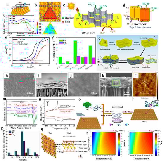 (a) The DFT energy profile of CO2, CO and CH4 through the triangular hole of the GDY cover. (b) The DFT potential energy surface of the CO2 molecule underneath the GDY. The color map (in eV) is plotted for the triangular region underneath the GDY. Reprinted with permission from Ref. []. Copyright Elsevier, 2019. (c) Possible reaction mechanism for photocatalytic reduction of CO2 over 2D CN-COF. (d) Schematic illustration of type II heterojunction of 2D CN-COF. (e) Tauc plots of the prepared catalysts. (f) Catalytic activities of the prepared catalysts. Reprinted with permission from Ref. []. Copyright Elsevier, 2021. (g) Schematic diagram of the synthesis process of MoS2 SILM, demonstrating the ionic liquid is confined in the MoS2 two-dimensional channels via infiltration. (h) Surface and (i) cross-section SEM images of the MoS2 membrane. (j) Surface and (k) cross-section SEM images of MoS2 SILM-3. (l) AFM image of the MoS2 sheet. The lateral dimension is scaled between two plus signs (inset). The MoS2 sheet is 1.2 nm thick. The sharp drop in the height profile is due to the silicon substrate. (m) FTIR spectra of MoS2 membrane, MoS2 SILMs and pure [BMIM][BF4]. (n) DSC curves of [BMIM][BF4] and MoS2 SILM-3. Reprinted with permission from Ref. []. Copyright American Chemical Society, 2017. (o) Illustration of the synthetic process of all-organic heterojunction with the 0D/2D heterostructure by a facile synthesis strategy. (p) Photocatalytic activity of the investigated samples after adding different amounts of 2BC. Reprinted with permission from Ref. []. Copyright Elsevier, 2021. (q) Top and side views of the graphene/Cu(111) catalyst. Gray, pink, orange, yellow, and transparent pink represent C, the first Cu layer, the second Cu layer, the third Cu layer, and the fourth Cu layer, respectively. (r) TOFs of ethanol and methane formation mapped with pressure (10–100 bar) and temperature (450–650 K). Reprinted with permission from Ref. []. Copyright Royal Society of Chemistry, 2023.