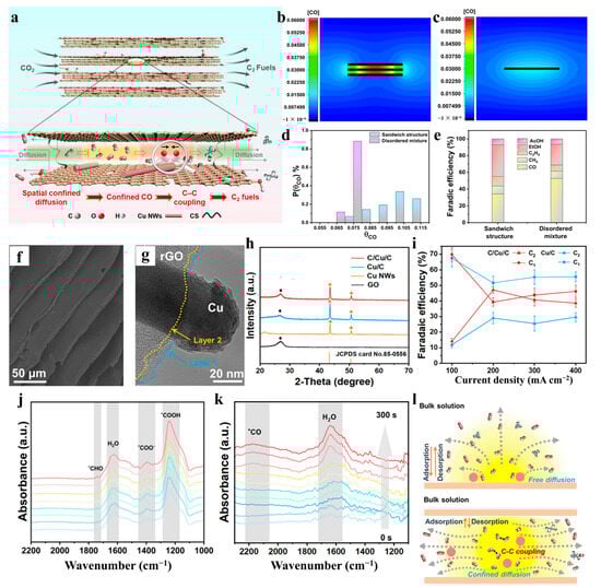 (a) Schematic diagram of mass transport in sandwich C/Cu/C. (b,c) Simulated CO concentration distributions in the sandwich structure (b) and the disordered mixture (c). (d) Simulated CO concentration distributions of the sandwich structure (blue bar) and disordered mixture (purple bar). (e) Simulated FE of C2 and C1 products among the carbonaceous products. Physical characterization of sandwich C/Cu/C. (f) SEM image. (g) TEM image. (h) XRD pattern. The peaks located at 431 and 511 belong to the diffraction of (100) and (110) facets of cubic Cu, respectively, and the broader peak centered at 271 corresponds to rGO. (i) FEs for C2 and C1 products at different applied current densities. (j) Electrochemical in situ FTIR spectra of Cu/C (−1.4 V vs. RHE) mixture from 0 to 300 s. (k) Electrochemical in situ FTIR spectra of sandwich C/Cu/C at a potential range from 0 to 300 s at 0.8 V. (l) Schematic diagrams of CO diffusion and confinement in the Cu/C mixture and sandwich C/Cu/C. Reprinted with permission from Ref. []. Copyright Royal Society of Chemistry, 2024.