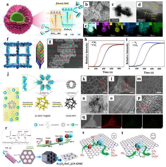 (a) Schematic diagram of the sunflower-like S-scheme WO3/ZnIn2S4 heterojunction. (b) SEM of W/ZIS-x. TEM (c), HRTEM (d) and high-angle annular dark field and EDX-mapping (energy dispersive X-ray spectroscopy) images (e) of W/ZIS-1 composite. Reprinted with permission from Ref. []. Copyright Elsevier, 2025. (f) Structural representations of 3D-IL-COF-3. C, blue; H, gray; N, red. (g) SEM image of 3D-IL-COF-3. Breakthrough curves for 3D-IL-COF-1 using the CO2/CH4 (h) and CO2/N2 (i) gas mixture. Reprinted with permission from Ref. []. Copyright American Chemical Society, 2018. (j) Schematic illustration of the synthesis of 1D/3D NPC. (k–m) 1D/3D NPC-1000. (n) TEM and (o,p) high-resolution TEM images of 1D/3D NPC-1000. (q) Elemental mapping images of 1D/3D NPC-1000. Reprinted with permission from Ref. []. Copyright John Wiley and Sons, 2024. (r) Schematic of the preparation process of Fe3O4-FeCx@N-OMC. (s,t) The reaction mechanism of CO2 hydrogenation on 0.8Fe-0.1K/N-OMC and 0.8Fe-0.1K@N-OMC. The red particles are Fe3O4 NPs and the light blue particles are FeCx NPs; the gray, blue, and yellow balls represent C, N, and K+, respectively. Reprinted with permission from Ref. []. Copyright Elsevier, 2021.