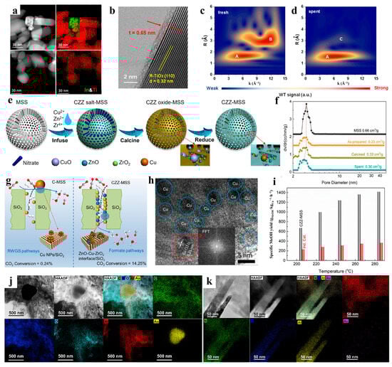 Structural evolution and catalytic performance of the In2O3−TiO2 catalyst during the CO2 hydrogenation reaction. (a) (top) High angle angular dark field-scanning transmission electron microscopy (HAADF-STEM) and EDX mapping images of fresh In2O3−TiO2. (bottom) HAADF-STEM and EDX mapping images of spent In2O3−TiO2. (b) HRTEM image of 2 wt% InOx nanolayers on the TiO2 surface after RWGS. (c,d) Wavelet transforms for the k3-weighted χ(k) In K-edge EXAFS signals of fresh and spent In2O3−TiO2 catalysts. Reprinted with permission from Ref. []. Copyright American Chemical Society, 2024. (e) Schematic procedure illustrating the synthesis of CZZ-MSS (CZZ stands for Cu-ZnO-ZrO2) with carefully designed MSS support. (f) Pore size distribution (PSD) curves of MSS and CZZ–MSS (as-synthesized, calcined, and spent). (g) Schematic of triphasic ZnO-Cu-ZrO2 confined inside mesoporous silica spheres for enhancing CO2 hydrogenation to methanol. (h) HRTEM images of CZZ–MSS. The blue circles highlight the Cu nanoparticles. (i) Plot of methanol yield versus temperature for CZZ–MSS catalyst and industrial catalysts. Reprinted with permission from Ref. []. Copyright American Chemical Society, 2023. (j,k) TEM, HAADF and TEM-EDX elemental mappings of 10–Au-θ-Al2O3/Au/PCN for the different specified regions. Reprinted with permission from Ref. []. Copyright Elsevier, 2023.