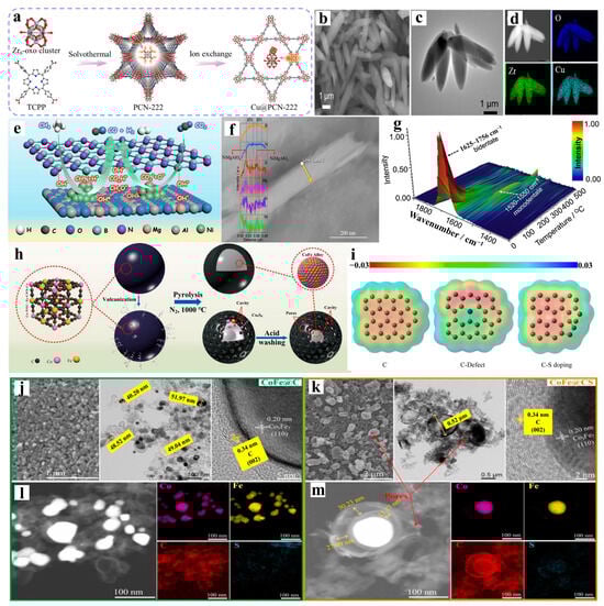 (a) Schematic illustration of synthesis of PCN-222 and anchoring of Cu clusters on Zr6-oxo clusters. (b) FESEM, (c) TEM, and (d) EDS elemental mapping images of Cu@PCN-222. Reprinted with permission from Ref. []. Copyright Elsevier, 2025. (e) Possible reaction mechanism over NiMA-BN-M-R catalysts. (f) SEM image with the line scan EDX analysis (inset) carried out over a distance of 1.00 µm on the cross-section of the fresh NiMA-BN-M-R catalyst. (g) In situ diffuse reflectance infrared Fourier transform spectroscopy (DRIFTs) of CO2-TPD. Reprinted with permission from Ref. []. Copyright Elsevier, 2019. (h) Schematic illustration of the synthesis of hollow core-shell CoFe@CS composites. (i) Distributions of electrostatic surface potential (ESP). (j,k) SEM, TEM and HRTEM images of CoFe@C and CoFe@CS; (l,m) EDS elemental mapping images of Co, Fe, C and S in CoFe@C and CoFe@CS. Reprinted with permission from Ref. []. Copyright Elsevier, 2023.