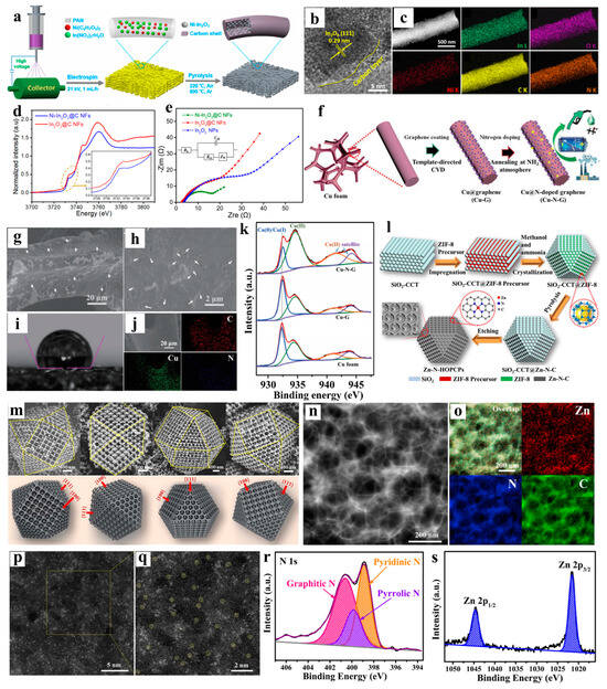 (a) Schematic diagram of synthesis procedure of Ni-In2O3@C NFs. HRTEM image (b), HAADF-STEM image and EDX elemental mappings (c) of Ni-In2O3@C NFs. (d) In L3-edge XANES spectra of In2O3@C NFs and Ni-In2O3@C NFs, the inset is an enlarged view of the yellow dashed circle area. (e) Nyquist plots and the corresponding fitting curves and equivalent circuit. Reprinted with permission from Ref. []. Copyright American Chemical Society, 2021. (f) Schematic preparation process of Cu@N-doped graphene electrocatalyst for electrocatalytic CO2 reduction. (g) SEM images of Cu-N-G with (g) low and (h) high magnifications. (i) Contact angle measurement. (j) Elemental mapping images of Cu-N-G. (k) XPS spectra of the Cu 2p signals for Cu, Cu-G, and Cu-N-G catalysts. Reprinted with permission from Ref. []. Copyright Springer Nature, 2022. (l) Illustration of the fabrication of the Zn-N-HOPCPs. (m) The SEM image of Zn-N-HOPCPs. (n) HAADF-STEM image of Zn-N-HOPCPs, and (o) corresponding element mappings. (p,q) Aberration-corrected HAADF-STEM images of the Zn-N-HOPCPs (isolated single Zn atoms are highlighted with light-yellow circles). (r) XPS spectra of Zn-N-HOPCPs N 1s. (s) XPS spectra of Zn-N-HOPCPs Zn 2p. Reprinted with permission from Ref. []. Copyright Elsevier, 2020.