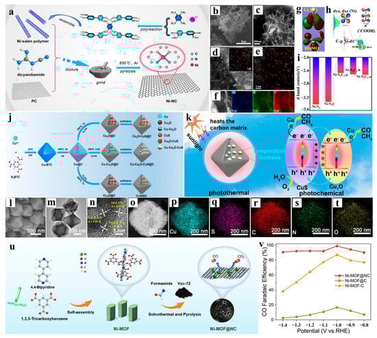 (a) Illustration of the accurate “metal pre-buried” strategy for the fabrication of Ni-N2C2 catalysts. (b) SEM images of Ni-NC-50. (c) TEM image. (d,e) Aberration-corrected HAADF-STEM images. (f) Elemental maps. (g) HOMO and lowest unoccupied molecular orbital of *COOH. (h) Schematic illustration of the interactions of the Ni dyz/dxz orbitals with the p* orbital of *COOH. (i) Calculated d-band centers of the five Ni SAC models. Reprinted with permission from Ref. []. Copyright Royal Society of Chemistry, 2022. (j) Synthetic scheme of the fabrication routes of Cu-based nanoparticles embedded in porous carbon octahedra derived from the Cu-BTC octahedron precursor. (k) Schematic illustration of the charge transfer pathway and photothermal catalytic mechanism for CO2 photoreduction over Cu-Cu2O-CuS@C. (l) SEM, (m) TEM, (n) HRTEM, (o) STEM, and (p–t) the corresponding elemental mapping images of Cu-Cu2O-CuS@C. Reprinted with permission from Ref. []. Copyright Royal Society of Chemistry, 2023. (u) Schematic diagram for the preparation of the Ni-MOF@NC composite. (v) FECO of Ni-MOF@NC, Ni-MOF@C, and Ni-MOF-C. Reprinted with permission from Ref. []. Copyright American Chemical Society, 2024.